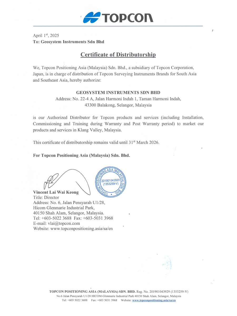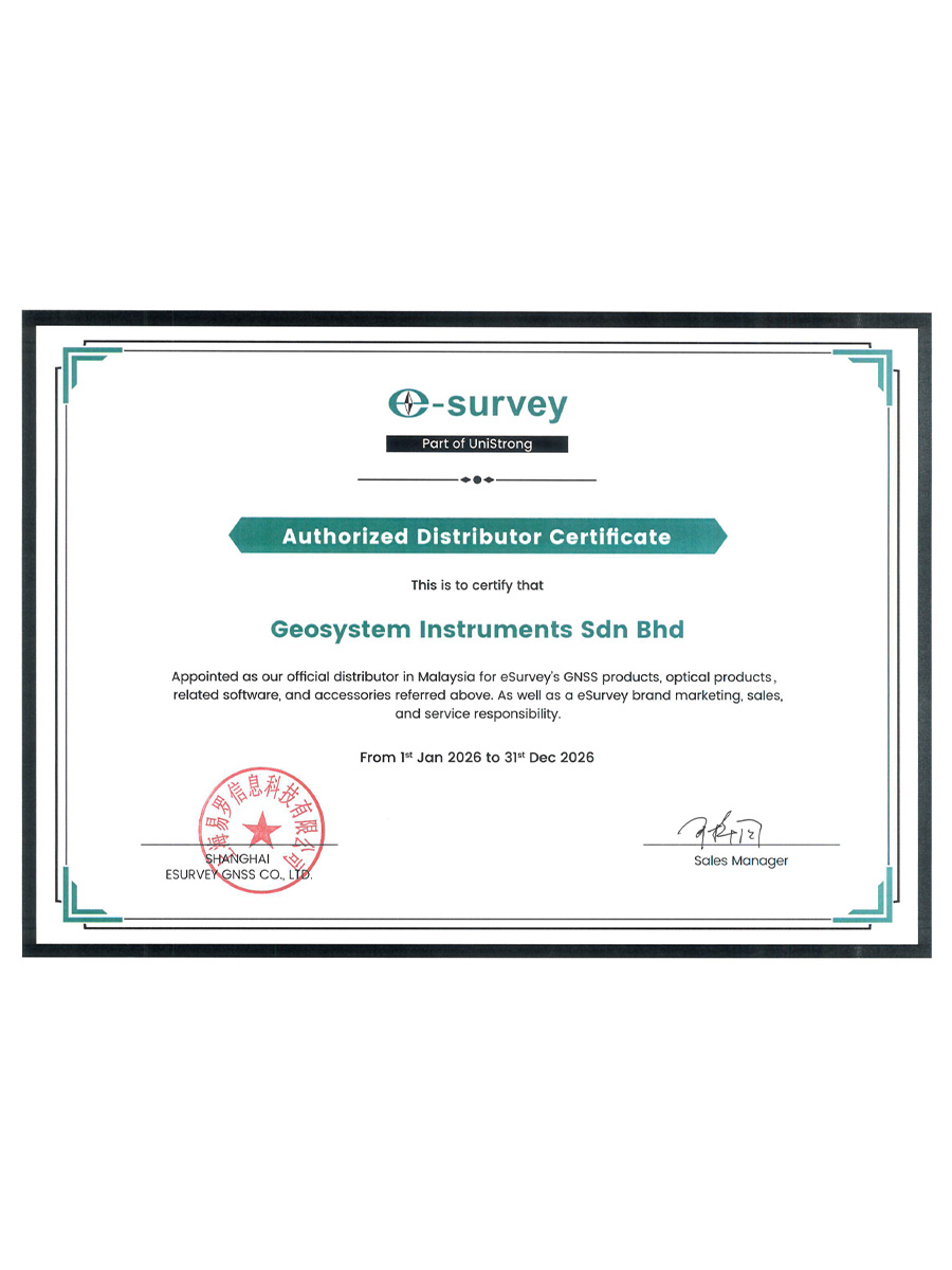 The company was established since 2001. The company is the sole distributor for e-Survey, Pentax and KDS for Malaysia. With Pentax reliable quality, reasonable prices and our prompt services, we believe we can become your one stop surveying solution provider.